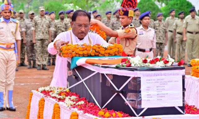 मुख्यमंत्री श्री विष्णु देव साय ने बीजापुर जिले के उसूर क्षेत्र में नक्सल विरोधी अभियान के दौरान अदम्य साहस का परिचय देते हुए शहीद सीआरपीएफ कोबरा बटालियन के कांस्टेबल श्री सोलंकी मेहुल भाई नंदलाल को भावभीनी श्रद्धांजलि अर्पित की और पार्थिव शरीर को कंधा देकर उनके गृह राज्य रवानगी से पूर्व अंतिम विदाई दी। मुख्यमंत्री आज माना स्थित चौथी वाहिनी छत्तीसगढ़ सशस्त्र बल परिसर पहुंचकर शहीद के पार्थिव शरीर पर पुष्पचक्र अर्पित किए और उन्हें नमन किया।