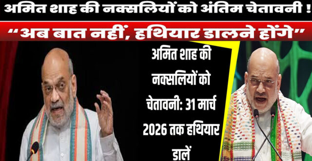 केंद्रीय गृह मंत्री अमित शाह ने छत्तीसगढ़ के बस्तर में नक्सलियों को अंतिम चेतावनी दी है। उन्होंने कहा कि नक्सलियों को 31 मार्च 2026 तक हथियार डालने होंगे। अमित शाह ने स्पष्ट किया कि नक्सलियों के साथ बातचीत की कोई संभावना नहीं है। उन्होंने यह भी कहा कि सरकार बस्तर और नक्सल प्रभावित क्षेत्रों के विकास के लिए प्रतिबद्ध है।