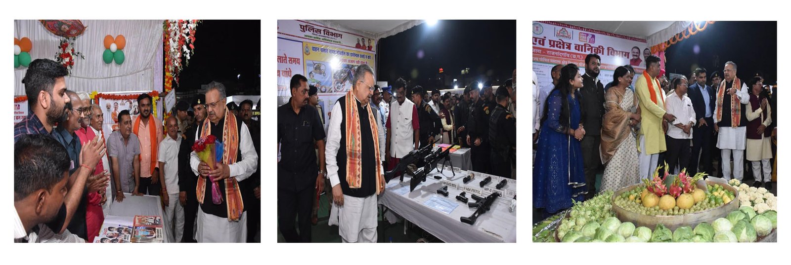 शिक्षा विभाग के स्टॉल में चंद्रयान-3 का मॉडल, पर्यावरण में मिथेन गैस पर आधारित विषैली एवं प्रदूषित गैस को अवशोषित कर दूर करने का मॉडल प्रदर्शित किया गया तथा स्कूली बच्चों के लिए शासन की विभिन्न योजनाओं की जानकारी दी गई है। राष्ट्रीय ग्रामीण आजीविका मिशन बिहान के स्टॉल में चिला, फरा, चौसेला, अईरसा, ठेठरी खुर्मी जैसे व्यंजन उपलब्ध है। सीएसईबी के स्टॉल में प्रधानमंत्री सूर्यघर मुफ्त बिजली योजना के संबंध में जानकारी दी जा रही है और लोगों को इस योजना का अधिक से अधिक लाभ लेने के लिए प्रेरित किया जा रहा है। पुलिस विभाग के स्टॉल में साइबर जागरूकता, सड़क सुरक्षा, नवा विहान की जानकारी दी जा रही है तथा विभिन्न शस्त्रों का प्रदर्शन किया गया है। परिवहन विभाग के स्टॉल में लर्निंग लायसेंस बनाने तथा हाई सिक्युरिटी नंबर प्लेट संबंधी कार्य किया जा रहा है।