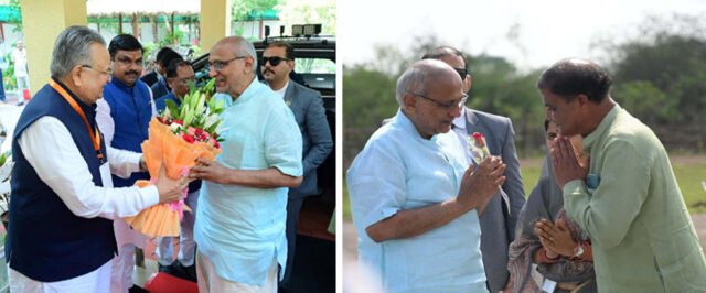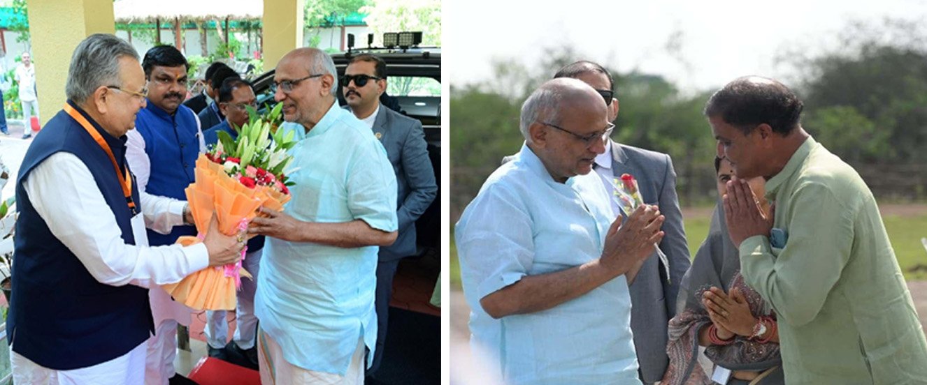 राजनांदगांव। उपराष्ट्रपति श्री सीपी राधाकृष्णन का पुलिस प्रशिक्षण विद्यालय (पीटीएस) ग्राउंड स्थित हेलीपैड पहुंचने पर राज्यपाल श्री रामेन डेका, मुख्यमंत्री श्री विष्णुदेव साय एवं विधानसभा अध्यक्ष डॉ. रमन सिंह ने भावमय स्वागत किया गया। उपराष्ट्रपति से स्थानीय जनप्रतिनिधियों एवं प्रशासनिक अधिकारियों ने सौजन्य भेंट की और पुष्प भेंट कर आत्मीय अभिनंदन किया। पूरे परिसर में स्वागत की तैयारियां भव्य एवं गरिमामय वातावरण में की गई। जिला प्रशासन द्वारा सुरक्षा एवं व्यवस्थाओं के सख्त और सुव्यवस्थित प्रबंध किए गए थे। अधिकारियों और पुलिस बल की तैनाती के साथ पूरी तरह चाक-चौबंद व्यवस्था रही।