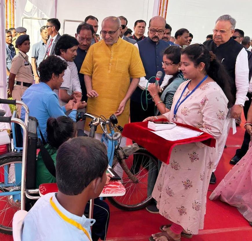 राजनांदगांव । उपराष्ट्रपति श्री सीपी राधाकृष्णन स्टेट हाई स्कूल मैदान राजनांदगांव में आयोजित लखपति दीदी सम्मेलन कार्यक्रम में शामिल हुए। कार्यक्रम में राज्यपाल श्री रामेन डेका, मुख्यमंत्री श्री विष्णुदेव साय, विधानसभा अध्यक्ष डॉ. रमन सिंह, स्कूल शिक्षा मंत्री श्री गजेन्द्र यादव, लोक स्वास्थ्य और परिवार कल्याण मंत्री श्री श्याम बिहारी जायसवाल एवं अन्य जनप्रतिनिधि उपस्थित रहे। इस दौरान उपराष्ट्रपति श्री सीपी राधाकृष्णन ने सुशासन पथ में सीआरसी राजनांदगांव एवं समाज कल्याण विभाग के स्टॉल में विभिन्न पुनर्वास सेवाओं एवं सहायक उपकरणों का अवलोकन किया। उपराष्ट्रपति श्री सीपी राधाकृष्णन को सीआरसी की विभिन्न गतिविधियों एवं सेवाओं के संबंध में जानकारी दी गई। इस दौरान उपराष्ट्रपति ने एक दिव्यांग को नियुक्ति पत्र प्रदान किया। उन्होंने चार हितग्राहियों को कृत्रिम पैर (बीके प्रोस्थेसिस), मोटराइज्ड ट्राइसाइकिल, सीपी चेयर एवं सुगम्यता सहयोग हेतु मोबाइल फोन सहायक उपकरण वितरित किया। उपराष्ट्रपति को सीआरसी के लाभार्थी ने निर्मित चित्रकला को कृतज्ञता स्वरूप भेंट किया गया। उपराष्ट्रपति एवं अन्य अतिथियों ने सीआरसी के स्टॉल का भ्रमण किया तथा प्रदर्शित सहायक उपकरणों, पुनर्वास सेवाओं एवं गतिविधियों की सराहना की। इस अवसर पर महापौर श्री मधुसूदन यादव, जिला पंचायत अध्यक्ष श्रीमती किरण वैष्णव, अध्यक्ष छत्तीसगढ़ श्रम कल्याण मंडल श्री योगेशदत्त मिश्रा, पूर्व सांसद श्री प्रदीप गांधी, श्री खूबचंद पारख, श्री सचिन बघेल, श्री दिनेश गांधी, श्री रमेश पटेल, श्री संतोष अग्रवाल, श्री अशोक चौधरी, श्री सौरभ कोठारी, श्री भावेश बैद, पद्मश्री फूलबासन यादव, संभागायुक्त श्री सत्यनारायण राठौर, पुलिस महानिरीक्षक श्री अभिषेक शांडिल्य, कलेक्टर श्री जितेन्द्र यादव, पुलिस अधीक्षक श्रीमती अंकिता शर्मा, मुख्य कार्यपालन अधिकारी जिला पंचायत सुश्री सुरूचि सिंह, निदेशक सीआरसी डॉ. स्मिता महोबिया सहित अन्य जनप्रतिनिधि एवं अधिकारी उपस्थित रहे।