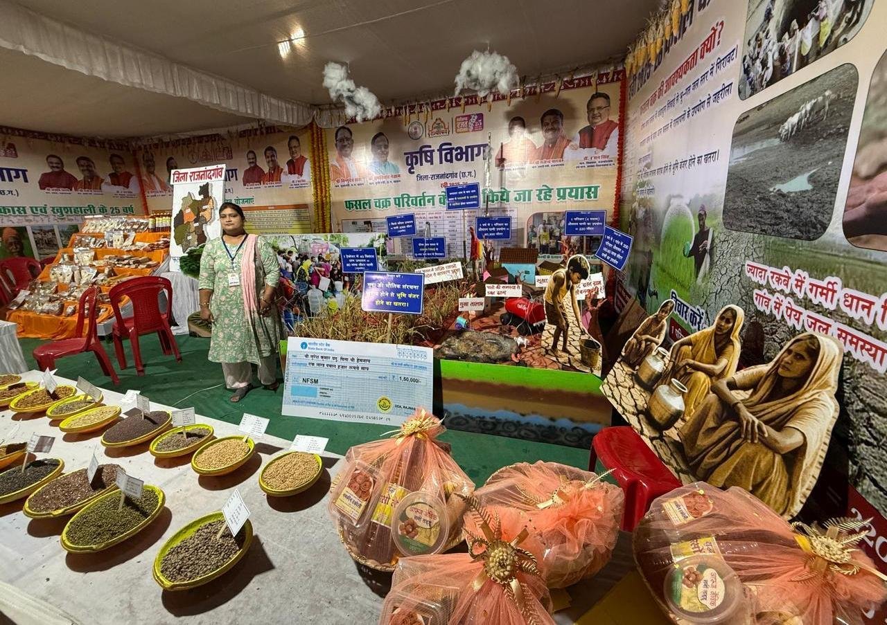 इसके साथ ही प्रदर्शनी में दलहन एवं तिलहनी फसलों के अधिक उत्पादन देने वाले कम जल मांग वाली किस्म का प्रदर्शन भी किया गया। जिससे किसान को बीजों के चुनाव में आसानी हो साथ ही महिला समूह द्वारा तैयार किए गए उत्पाद जिसमें परंपरागत कृषि विकास योजना एवं जैविक खेती मिशन अंतर्गत जैविक रागी, कोदो एवं जैविक चावल तथा कच्ची घानी के सरसों तेल व अन्य उत्पादों की प्रदर्शनी भी स्टॉल के माध्यम से किया। इस वर्ष कृषि विभाग की यह प्रदर्शनी अपने अनोखे विषय एवं प्रस्तुतीकरण के लिए राज्योत्सव मेले में चर्चा का विषय रहा।