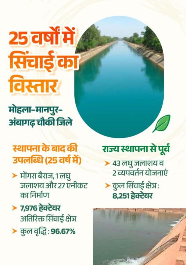 छत्तीसगढ़ राज्य स्थापना के 25 वर्ष के सफर में जल संसाधन विभाग द्वारा मोहला-मानपुर-अंबागढ़ चौकी जिले में सिंचित क्षेत्र में उल्लेखनीय प्रगति की है। राज्य स्थापना के पश्चात् वर्ष 2008 में मध्यम परियोजना-मोंगरा बैराज परियोजना, 01 लघु जलाशय और 27 एनीकट का निर्माण किया गया है। जिससे कुल 7976 हे. क्षेत्र में सिंचाई सुविधा का विस्तार किया गया है। जिससे लगभग 96.67 प्रतिशत वृद्धि हुई है।