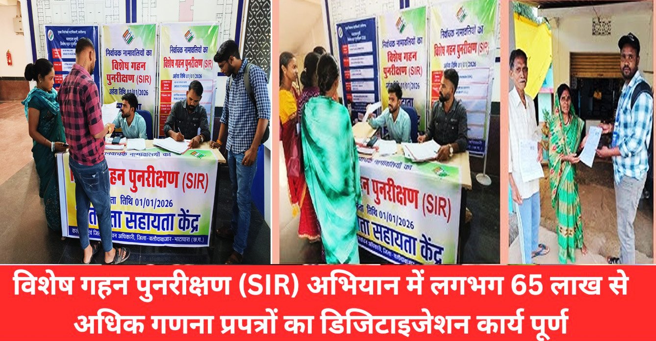 रायपुर: छत्तीसगढ़ राज्य में अर्हता तिथि 01 जनवरी 2026 के लिए मतदाता सूचियों के विशेष गहन पुनरीक्षण (SIR) कार्य का संचालन दिनांक 04 नवम्बर 2025 से पूरी गंभीरता एवं पारदर्शिता के साथ जारी है। प्रदेशभर में पंजीकृत मतदाताओं को गणना प्रपत्र का वितरण लगभग पूर्ण हो चुका है तथा इन प्रपत्रों के संग्रहण और डिजिटाइजेशन का कार्य तेजी से प्रगति पर है।आज 22 नवम्बर 2025 तक प्रदेश में लगभग 78 लाख से अधिक गणना प्रपत्रों का डिजिटाइजेशन पूर्ण हो चुका है, जो प्रदेश के 2 करोड़ 12 लाख 30 हजार 737 पंजीकृत मतदाताओं का लगभग 37 प्रतिशत है।