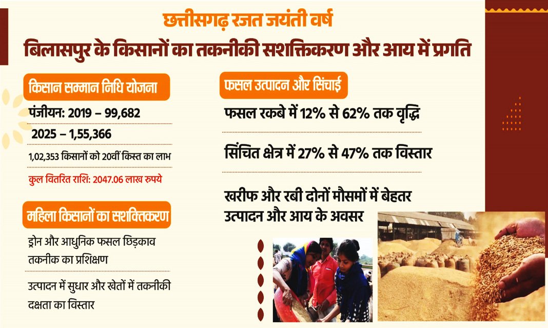 छत्तीसगढ़ रजत जयंती वर्ष में कृषि योजनाओं का प्रभावी क्रियान्वयन, तकनीकी प्रशिक्षण और किसानों की सक्रिय भागीदारी बिलासपुर जिले को कृषि विकास के मार्ग पर मजबूती से आगे ले जा रही है और किसानों की आर्थिक स्थिति को सुदृढ़ बना रही है।