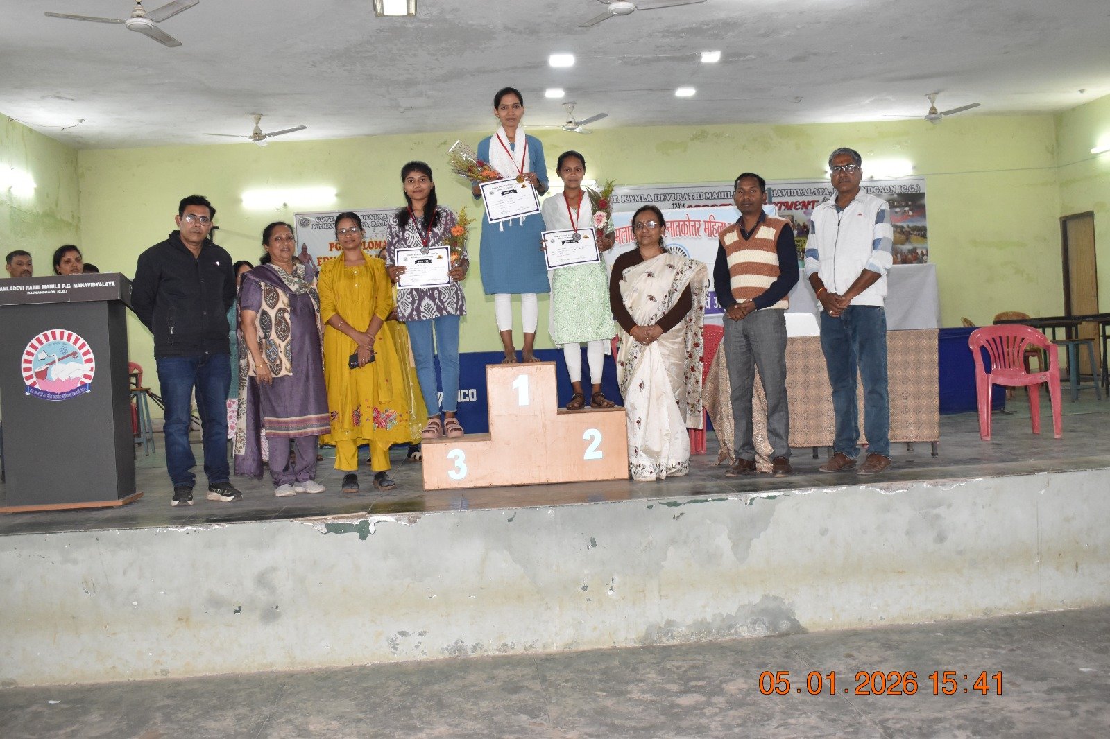 इंडोर प्रतियोगिता का परिणामों में टेबल टेनिस में प्रथम भारती कंवर (बीएससी तृतीय वर्ष), द्वितीय दिव्या शर्मा (बीएससी तृतीय सेमे.), तृतीय योगिता (बीएससी तृतीय सेमे.), बैडमिंटन में प्रथम प्रीति तारम (बीएससी तृतीय वर्ष), द्वितीय माही तुलावी (बी.कॉम प्रथम सेमे.), तृतीय देविका साहू (बीएससी तृतीय वर्ष), कैरम में प्रथम देविका साहू (बीएससी तृतीय वर्ष), द्वितीय चन्द्रा बंजारे (बीएससी तृतीय सेमे.), तृतीय संजना साहू (बीएससी तृतीय वर्ष), शतरंज में प्रथम प्रज्ञा बाम्बेश्वर (बीए तृतीय सेमे.), द्वितीय रूचिका साहू (बीएससी प्रथम सेमे.), तृतीय दिव्या शर्मा (बीएससी तृतीय सेमे.), 100 मीटर दौड़ में प्रथम अंजली निपाद (बीएससी तृतीय वर्ष), द्वितीय मंजू धुर्वे (बीएससी प्रथम सेमे.), तृतीय धनेश्वरी (बीए तृतीय सेमे.), गोली चम्मच दौड़ में प्रथम अहिल्या (बीएससी प्रथम सेमे.), द्वितीय दिव्या शर्मा (बीएससी तृतीय सेमे.), तृतीय मिली कोरी (बीएससी तृतीय वर्ष), स्लो साईकल रेस सोना साहू (बीए प्रथम सेमे.), द्वितीय भारती साहू (बीए प्रथम सेमे.), तृतीय भारती कंवर (बीएससी तृतीय वर्ष), तीन तंगड़ी दौड़ में प्रथम वेदिका पाल (बीएससी प्रथम सेमे.) एवं ललिता (बीएससी प्रथम सेमे.), द्वितीय लोकेश्वरी (बीए तृतीय वर्ष) एवं पुनम यादव (बीएससी तृतीय वर्ष), तृतीय प्रिया पटेल (बीएससी तृतीय सेमे.) एवं अंजली निपाद (बीएससी तृतीय सेमे.), लंबी कूद में प्रथम कावेरी यादव (बीए प्रथम सेमे.), द्वितीय निलेश्वरी (बीएससी तृतीय सेमे.), तृतीय धनेश्वरी (बीए तृतीय सेमे.), गोला फेंक में प्रथम चांदनी (बीए तृतीय वर्ष), द्वितीय लोकेश्वरी (बीए तृतीय वर्ष), तृतीय कावेरी यादव (बीए प्रथम सेमे.), रिले रेस में प्रथम निकिता-सोना-भारती-कावेरी, द्वितीय लोकेश्वरी-अंजली-पूनम-प्रिया तृतीय जागृति-देविका-रोशनी-पिंकी, चक्र फेंक में प्रथम चांदनी घावड़े (बीए तृतीय वर्ष), द्वितीय रीना यादव (बीए तृतीय वर्ष) एवं तृतीय पूनम यादव (बीए तृतीय वर्ष) है।