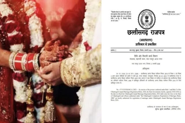 छत्तीसगढ़ सरकार ने प्रदेश में विवाह पंजीयन को अनिवार्य कर दिया है। विधि-विधायी कार्य विभाग की ओर से इस संबंध में राजपत्र में अधिसूचना जारी की गई है।