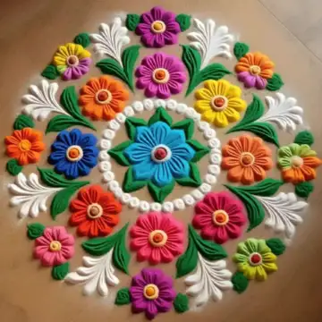 ये रंगोली डिजाइन काफी प्यारा है. इसमें छोटे-छोटे रंग-बिरंगे फूल बनाए गए हैं. साथ ही हरी पत्तियां भी दी गई हैं. इन फूलों को बनाने के लिए मार्केट से आप कलर वाली बोतल ला सकते हैं. इससे इस डिजाइन को बनाना और भी आसान हो जाता है.