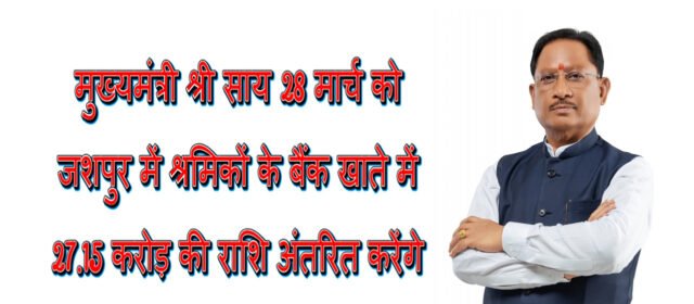 मुख्यमंत्री श्री विष्णु देव साय के मुख्य आतिथ्य में शनिवार 28 मार्च को दोपहर 01 बजे जिला मुख्यालय जशपुर के वशिष्ठ कम्युनिटी हॉल में जिला स्तरीय श्रमिक सम्मेलन आयोजित होगा। मुख्यमंत्री द्वारा श्रम विभाग के अंतर्गत 12 विभिन्न श्रमिक कल्याणकारी योजनाओं के अंतर्गत 79,340 निर्माण श्रमिकों एवं उनके परिजनों को 27.15 करोड़ रुपए की राशि डीबीटी के माध्यम से सीधे लाभार्थियों के बैंक खातों में अंतरित किया जाएगा।
