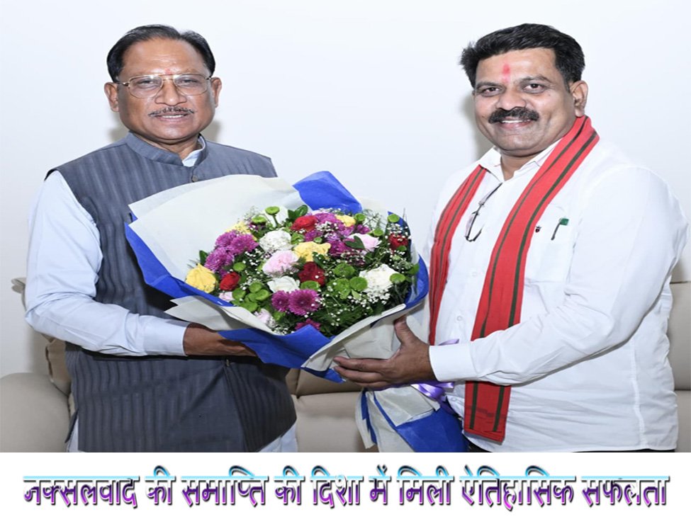 छत्तीसगढ़ में नक्सलवाद की समाप्ति की दिशा में मिली ऐतिहासिक सफलता के बीच आज मुख्यमंत्री श्री विष्णुदेव साय से उनके नवा रायपुर स्थित निवास कार्यालय में उपमुख्यमंत्री श्री विजय शर्मा ने सौजन्य मुलाकात की। इस अवसर पर श्री शर्मा ने मुख्यमंत्री को नक्सलवाद के खात्मे की दिशा में मिली इस बड़ी उपलब्धि पर बधाई देते हुए पुष्पगुच्छ भेंट कर उनका अभिनंदन किया।