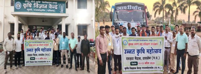 राजनांदगांव” राष्ट्रीय कृषि मेला का आयोजन 13 अप्रैल 2026 को मध्यप्रदेश के रायसेन में किया जा रहा है। इस राष्ट्रीय कृषि मेला में सम्मिलित होने हेतु कृषक भ्रमण सह प्रशिक्षण कार्यक्रम अंतर्गत राजनांदगांव एवं मोहला-मानपुर-अम्बागढ़ चौकी जिले से चयनित 30 उन्नत किसानों के दल को रायसेन मध्यप्रदेश के लिए रवाना किया गया। कृषकों को नवाचार, नवीन तकनीक एवं उन्नत खेती की जानकारी प्राप्त करने के उद्देश्य से पूरी तैयारी एवं आवश्यक सुविधाओं के साथ भेजा गया है। जिससे वे आधुनिक कृषि पद्धतियों को सीखकर अपने क्षेत्र में लागू कर सकें। इस अवसर पर कृषि विज्ञान केंद्र राजनांदगांव के वरिष्ठ वैज्ञानिक एवं प्रमुख डॉ. गुंजन झा ने कृषकों को राष्ट्रीय कृषि मेला में सहभागिता हेतु शुभकामनाएं दी। इस दौरान प्रभारी डॉ. योगेंद्र श्रीवास, कार्यक्रम सहायक पौध रोग श्री जितेंद्र मेश्राम तथा प्रक्षेत्र प्रबंधक श्री आशीष गौरव शुक्ला एवं श्री यशवंत वैष्णव उपस्थित रहे।