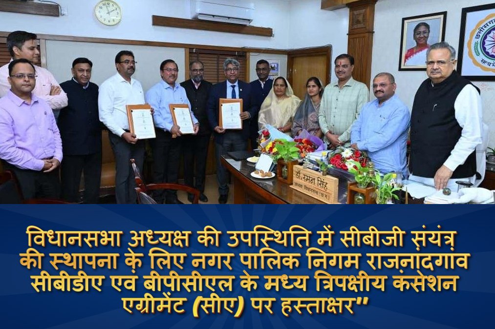 राजनांदगांव” विधानसभा अध्यक्ष डॉ. रमन सिंह की उपस्थिति में आज स्पीकर हाऊस रायपुर में सीबीजी संयंत्र की स्थापना के लिए नगर पालिक निगम राजनांदगांव, सीबीडीए एवं बीपीसीएल के मध्य त्रिपक्षीय कंसेशन एग्रीमेंट (सीए) पर हस्ताक्षर किया गया। इस एग्रीमेंट के तहत नगर पालिक निगम राजनांदगांव अंतर्गत ग्राम बोईरडीह में बीपीसीएल द्वारा स्वयं के निवेश से सीबीजी संयंत्र की स्थापना की जाएगी।