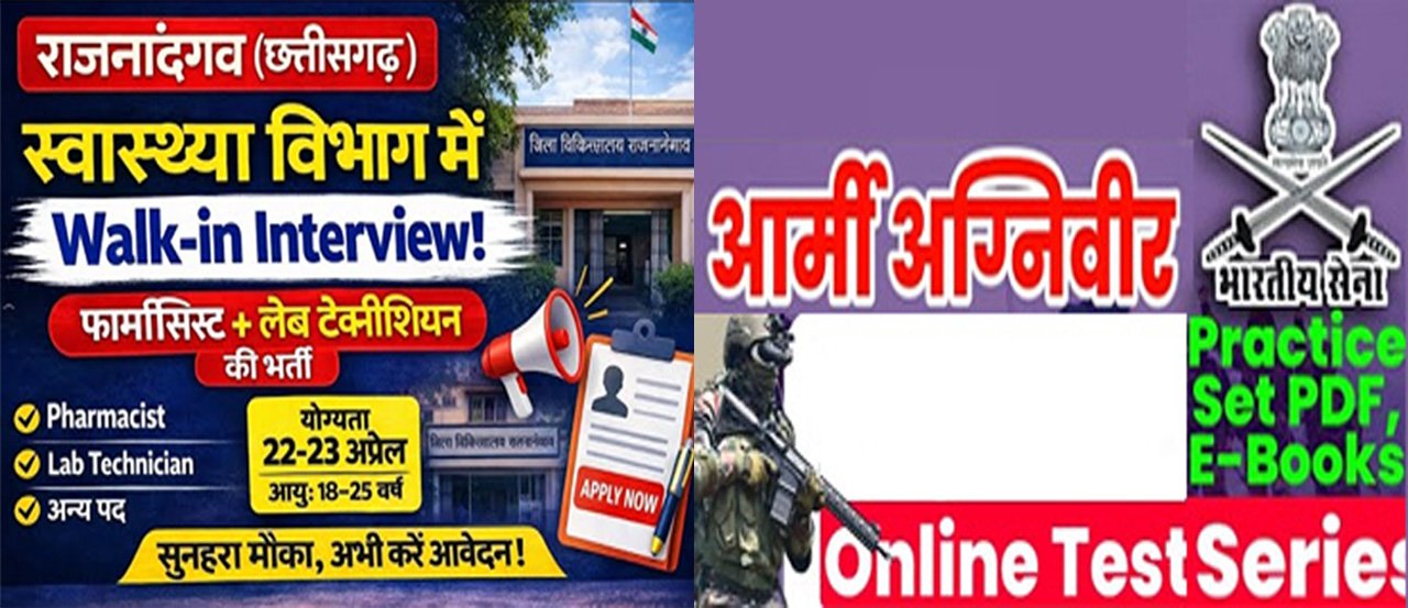 राजनांदगांव” जिला खनिज संस्थान न्यास मद 2025-26 के तहत जिला चिकित्सालय राजनांदगांव में फार्मसिस्ट के 10 पद एवं मेडिकल लैब टेक्नीशियन के 2 पदों पर संविदा भर्ती हेतु वॉक इन इंटरव्यू का आयोजन किया गया है। फार्मासिस्ट पद पर संविदा भर्ती के लिए 22 अप्रैल 2026 एवं मेडिकल लैब टेक्नीशियन पद पर संविदा भर्ती के लिए 23 अप्रैल 2026 को कार्यालय मुख्य चिकित्सा एवं स्वास्थ्य अधिकारी जिला राजनांदगांव गुरूद्वारा के सामने वॉक इन इंटरव्यू का आयोजन किया जाएगा। आवेदन का पंजीयन सुबह 10 बजे से दोपहर 12 बजे तक, पात्र-अपात्र सूची का प्रकाशन दोपहर 1.30 बजे, दावा आपत्ति प्राप्ति का समय दोपहर 2 बजे तक तथा दावा आपत्ति का निराकरण एवं मेरिट सूची का प्रकाशन शाम 5 बजे किया जाएगा।