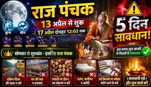 ज्योतिषीय गणना के अनुसार, इस बार पंचक सोमवार, 13 अप्रैल को शुरू हुए थे. इसे राज पंचक कहा जाता है. जिसका समापन 17 अप्रैल 2026, शुक्रवार को दोपहर 12 बजकर 2 मिनट पर होगा. यानी 16 अप्रैल तक पंचक का प्रभाव पूरी तरह बना रहेगा और 17 अप्रैल को दोपहर बाद से सभी शुभ कार्यों के लिए रास्ता साफ हो जाएगा.