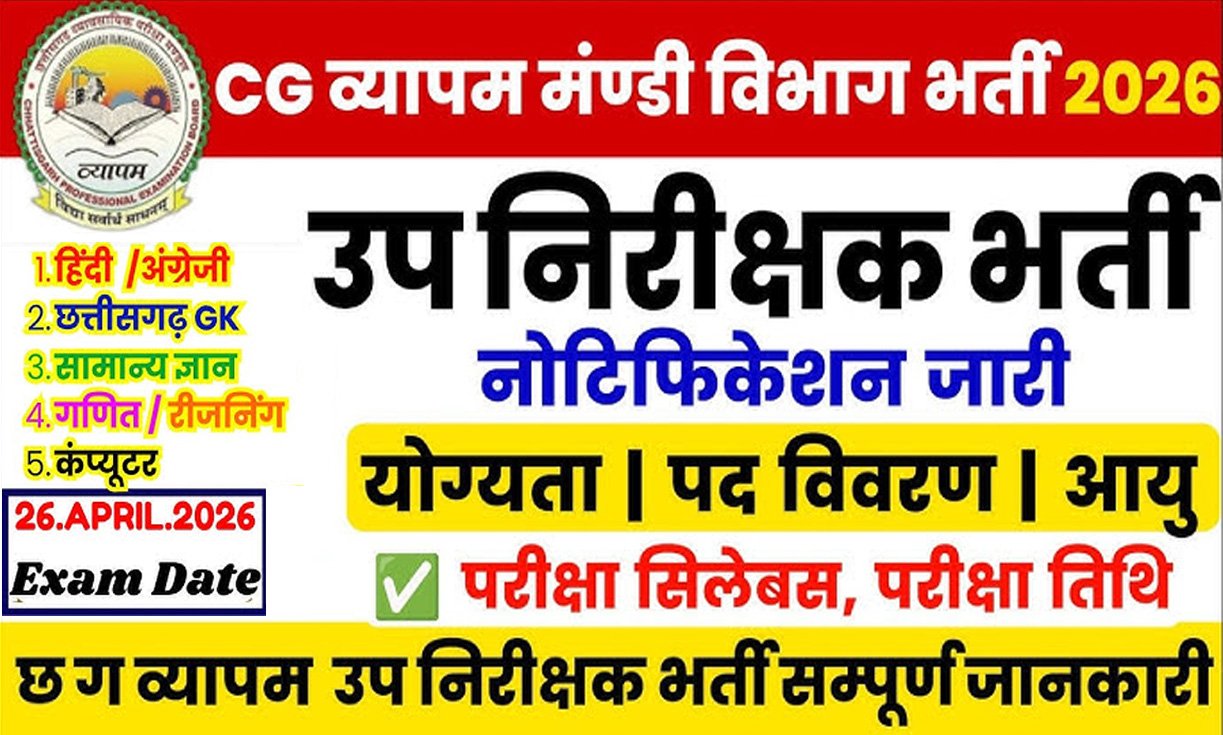छत्तीसगढ़ व्यावसायिक परीक्षा मंडल रायपुर द्वारा 26 अप्रैल 2026 को छत्तीसगढ़ राज्य कृषि विपणन (मंडी) बोर्ड अंतर्गत उप निरीक्षक भर्ती परीक्षा का राज्यव्यापी आयोजन किया जा रहा है।
